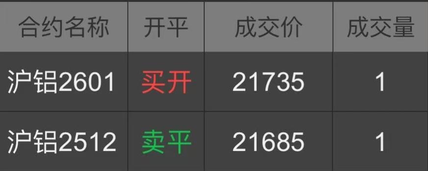 | 一、开仓总结 苹果:2025年9月22日,达到启动点的开仓条件,所以在14:54开多一手苹果2601合约,开仓价为8288。 沪铝:2025年10月13日,达到启动点的开仓条件,所以在14:32开多一手沪铝2511合约,开仓价为20885。沪铝2511合约于2025年10月17日14:45移仓至主力合约2512,开仓价为20885。沪铝2512合约于2025年11月10日13:30移仓至主力合约2601,开仓价为21735。