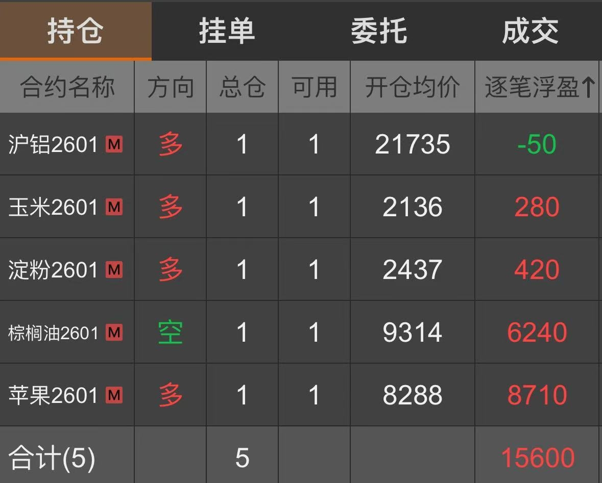 棕榈油:2025年10月17日,达到启动点的开仓条件,所以在14:45开空一手棕榈油2601合约,开仓价为9304。 淀粉:2025年10月31日,达到启动点的开仓条件,所以在14:49开多一手淀粉2601合约,开仓价为2437。 玉米:2025年11月4日,达到启动点的开仓条件,所以在14:51开多一手玉米2601合约,开仓价为2136。 二、平仓计划 苹果:达到启动点的平仓止损/止盈条件,在收盘前或下一个交易日开盘后全部平仓。 沪铝:达到启动点的平仓止损/止盈条件,在收盘前或下一个交易日开盘后全部平仓。 棕榈油:达到启动点的平仓止损/止盈条件,在收盘前或下一个交易日开盘后全部平仓。 淀粉:达到启动点的平仓止损/止盈条件,在收盘前或下一个交易日开盘后全部平仓。 玉米:达到启动点的平仓止损/止盈条件,在收盘前或下一个交易日开盘后全部平仓。 注:本交易总结由第三方提供,只作为投资理念和方法的交流,不作为七禾网的观点,也不作为投资参考和建议。 附: 1、交易者简介 十年股票/期货/外盘交易经验,每年都实现投资盈利。 擅长微观盘面分析和宏观市场分析,总结了数套有效的盈利模式,和众多高手有深入交流,收益良好。 2、持仓截图