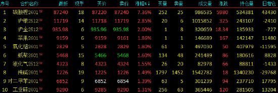 | 2025年11月10日,国内期货主力合约涨多跌少。碳酸锂涨超7%,沪银涨超2%,沪金、苹果、氧化铝、纸浆、液化石油气(LPG)、纯碱涨超1%;跌幅方面,玻璃跌近3%,集运欧线、沥青、焦炭、鸡蛋跌超1%。