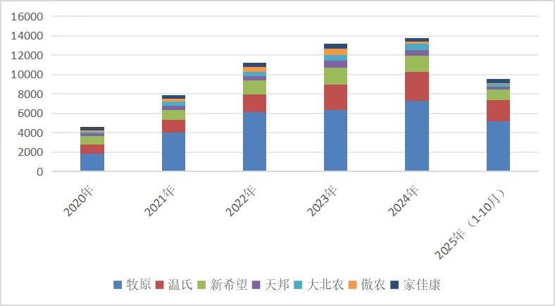 图5:部分上市公司年度商品猪出栏数据(单位:万头)