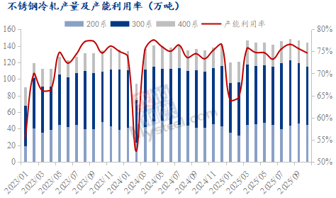 | 报告品种:不锈钢 原文链接:https://mp.weixin.qq.com/s/rKHEzn4uWmEK3jvp5IDaaA 1、不锈钢-冷轧产量 据Mysteel调研,2025年10月国内39家不锈钢冷轧产量合计144.56万吨,环比减少1.92万吨,减幅1.31%,同比增加7.26%。钢厂产能利用率为74.6%,环比下降1个百分点。 200系产量45.25万吨,环比减少1.4万吨,减幅3%,同比增加9.43%; 300系产量70.04万吨,环比减少3.04万吨,减幅4.16%,同比增加3.24%; 400系产量29.27万吨,环比增加2.52万吨,增幅9.42%,同比增加14.43%。 酒钢产量恢复,400系冷轧量环比有所增多。因部分钢厂接单较差,200系和300系冷轧量有所下滑,且300系冷轧降量较明显。 2025年1-10月,国内不锈钢冷轧产量累计约1404.7万吨,同比增加73.57万吨,增幅5.53%。其中200系量约426.1万吨,同比增加0.87万吨,增幅0.2%;300系量约709.38万吨,同比增加52.6万吨,增幅8.01%;400系量约269.22万吨,同比增加20.1万吨,增幅8.07%。