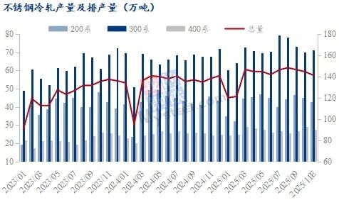 2、不锈钢-冷轧排产量 据Mysteel调研,2025年11月国内39家冷轧不锈钢厂冷轧排产预计为141.26万吨,预计环比减少3.3万吨,减幅2.28%,预计同比增加2.21%。 200系排产量42.68万吨,预计环比减少2.57万吨,减幅5.68%,预计同比减少6.99%; 300系排产量71.15万吨,预计环比增加1.11万吨,增幅1.58%,预计同比增加4.85%; 400系排产量27.43万吨,预计环比减少1.84万吨,减幅6.29%,预计同比增加12.16%。 钢厂减产,200系和400系冷轧排产有所减少,300系冷轧部分钢厂规划有增产。