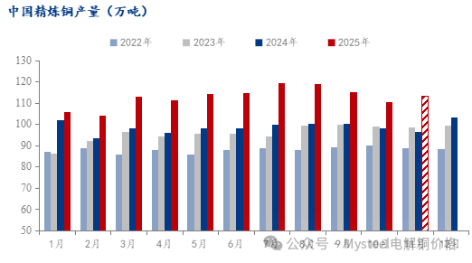 | 报告品种:铜 原文链接:https://mp.weixin.qq.com/s/LrEOGWJjJervHZSK_j9Hug Mysteel调研国内58家电解铜生产企业,涉及精炼产能1648万吨(含2025年新增产能)样本覆盖率98.93%得出:2025年10月国内电解铜实际产量110.61万吨,环比减少3.8%,同比增加12.89%。1-10月国内电解铜产量累计为1126.57万吨,同比增加14.46%。
