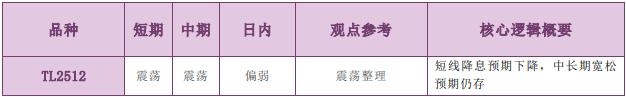 备注: 1.有夜盘的品种以夜盘收盘价为起始价格,无夜盘的品种以昨日收盘价为起始价格,当日日盘收盘价为终点价格,计算涨跌幅度。 2.跌幅大于 1%为弱势,跌幅 0~1%为偏弱,涨幅 0~1%为偏强,涨幅大于 1%为强势。 3.偏强/偏弱只针对日内观点,短期和中期不做区分。 ◼ 主要品种价格行情驱动逻辑—金融期货股指板块 品种:TL、T、TF、TS 日内观点:偏弱 中期观点:震荡参考观点:震荡整理核心逻辑:昨日国债期货均窄幅震荡整理。从宏观基本面来看,由于内需有效需求不足的问题仍存,中长期来看需要偏宽松的货币环境来稳定需求端,国债期货的支撑较强。不过宏观经济数据具备较强韧性,加上外部不确定性风险缓和,短期内全面降息的必要性不强,国债期货上行动能有限。总的来说,短期内国债期货上下空间均有限,以震荡整理为主。(仅供参考,不构成任何投资建议) 责任编辑:七禾小编 |