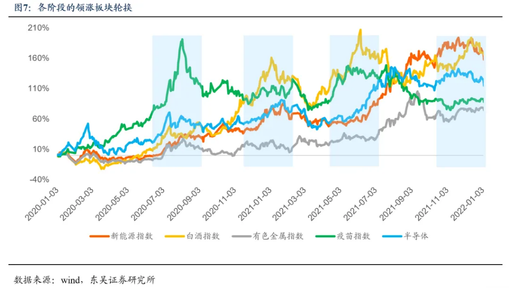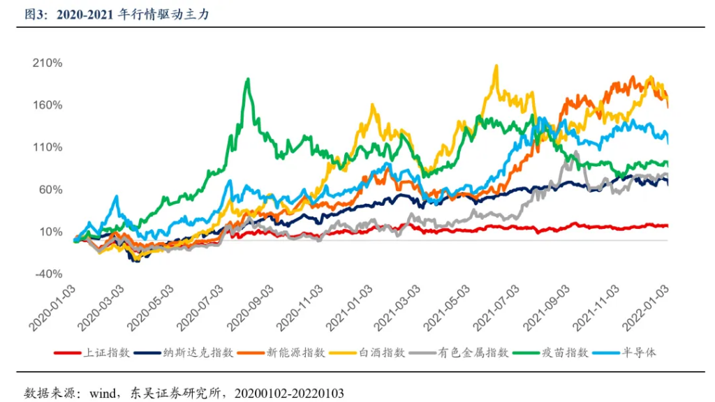 4.3. 产业趋势的发展节奏 2020-2021年行情,资金的共同选择主要基于行业本身有清晰且正在快速兑现的业绩作为压舱石,无论是“茅指数”还是“宁指数”还是医药产业链,均是由现实驱动,因疫情产生的产业周期中断并快速修复是产业趋势获得认可的主要原因,也是短期累积风险释放后投资者回归业绩基本面的选择。2025年的行情,从业绩来看,部分硬件公司业绩确实已经有释放,但AI等科技主线的上涨,更多是基于对颠覆性技术前景和国产替代空间的远期展望,伴随着更多的预期驱动。AI的商业化进程和业绩贡献大多尚在早期阶段,这意味着行情会伴随更大的波动性和不确定性。 4.4. 从两轮行情的异同点观测当前A股所处阶段 2020-2021年A股市场经历了三次明显的风格切换,形成了从医药科技消费到顺周期再到新能源半导体的轮动格局。2020年1-7月,医药、科技、消费板块成为市场主线。疫情初期线上经济爆发,医药(口罩、疫苗)、科技(半导体、5G)、消费(高端白酒、食品)领涨。“价值投资”被演绎到极致,各行业龙头公司先后创造历史新高。2020年8-10月,市场风格转向顺周期板块。随着国内疫情得到有效控制,经济复苏预期增强,叠加“十四五”规划预期,顺周期板块表现活跃。保险、房屋建设、煤炭、化工等板块获得主力资金青睐,北向资金对金融、材料行业的持股市值占比明显提升。这一阶段的典型特征是“估值切换”,资金从高估值的赛道转向低估值板块,顺周期板块更多集中在资源品和制造领域。进入2021年,1-2月延续2020年末强势,“茅指数”继续冲高,贵州茅台一度突破2600元;3-4月美债收益率快速上行引发全球成长股回调,A股核心资产大幅调整,“茅指数”单月最大回撤超20%。2021年5-9月,以新能源、半导体、周期为代表的“宁组合”崛起。这一阶段的核心驱动力是“双碳”目标、半导体自主可控的支持叠加全球供应链重构。2021年10-12月,政策转向“稳增长”,地产、金融等低估值板块阶段性反弹。然而,这种反弹并未改变结构性行情的本质,资金最后一次抱团在高景气赛道,至2021年12月,以“茅指数”和“宁组合”的泡沫破裂作为本轮行情的终点。