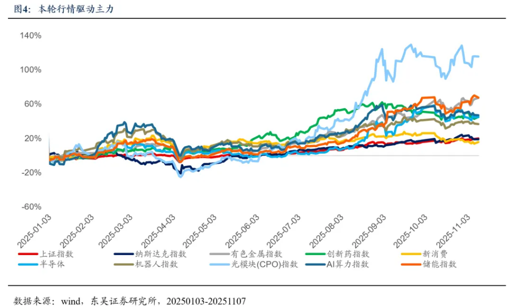 4. 当下行情走到了什么位置? 4.1. 宏观流动性的重要助力 当下阶段,国内和海外已经逐步开启宽松,在财政政策上均迎来扩张周期。但货币政策来看,国内更多使用结构性货币政策精准滴灌,海外尤其是美国仍然没有开启大规模的降息,对于货币政策相对克制,并叠加了关税这个较为不稳定的因素,导致全球的流动性环境处于波动之中。我们在《备战中选,迎接双宽——2026年度展望:海外政策》中提出,根据特朗普当下的主张以及美联储主席换届的落地,预计到2026年5月美联储新主席上任后,Fed Put将替代TACO对冲关税冲击,当前到明年底可能开启4次降息,大规模的流动性宽松即将到来。尽管本次流动性宽松不如2020年挽救冲击时的急迫,也大概率市场会进行提前交易,但随着降息通道开启,未来有可能带来更低的利率与更糟的信用,对美元体系的冲击更大,流动性从美向非美地区的转移有可能更甚从前。 4.2. 资金行为下的不同结构 2020-2021年虽是结构性行情,但“核心资产”涵盖的消费、医药等行业龙头普遍上涨,行情具有一定的广度。2025年来看,尽管前期新消费、创新药等行业出现过结构性带领市场向上的趋势,但行业涨幅来看,暂未形成2021年多行业共同大幅跑赢指数的趋势,结构性分化更为极致,资金高度集中地涌入科技板块。上一轮牛市中的“核心资产”如消费、医药等,由于业绩增速放缓,仅有部分细分板块在本轮行情中表现较好,创新药、新消费成为细分行业中的主流,但随着科技板块进一步吸纳资金,细分行业如新消费反而已经跑输指数。这意味着,若未押注科技主线,投资者极易面临“只赚指数不赚钱”的困境,市场整体的赚钱效应广度实则收窄。 回顾2020-2021年市场的资金结构,外资和公募成为主流推动力量。2021年外资大幅加仓A股,北向资金净流入超4300亿元,创历史新高,为市场提供了重要支撑。外资偏好配置的主要方向为产业前景明确、现金流健康、收益稳健的行业,因此“核心资产”获得大量北向资金青睐。2021年,北向资金大幅加仓电气设备,在白酒、医药、化工、有色、电子等制造业布局现金奶牛龙头,带动市场情绪和活跃度持续提升。此外,公募基金在结构性行情下也迎来了基金产品的发行高峰,居民通过公募基金入市,2020年新成立基金份额接近8000亿份,2021年11月,新发基金单月总数达189只,均创历史新高,进一步强化了结构性行情的特征。由于增量资金主力在外资和公募基金,市场的结构性风格不可避免,“核心资产”成为本轮行情的资金的最小阻力方向。而相比之下,2025年的市场资金结构,我们并未看到外资和公募新发基金参与到本轮行情中,这一轮行情更多由融资盘、量化资金、保险资金和战略资金带动,这也导致本轮资金选择的板块更加集中于经济长期转型需要支持的主要方向——科技。资金结构的变化正是当下两轮行情最大的差异点。