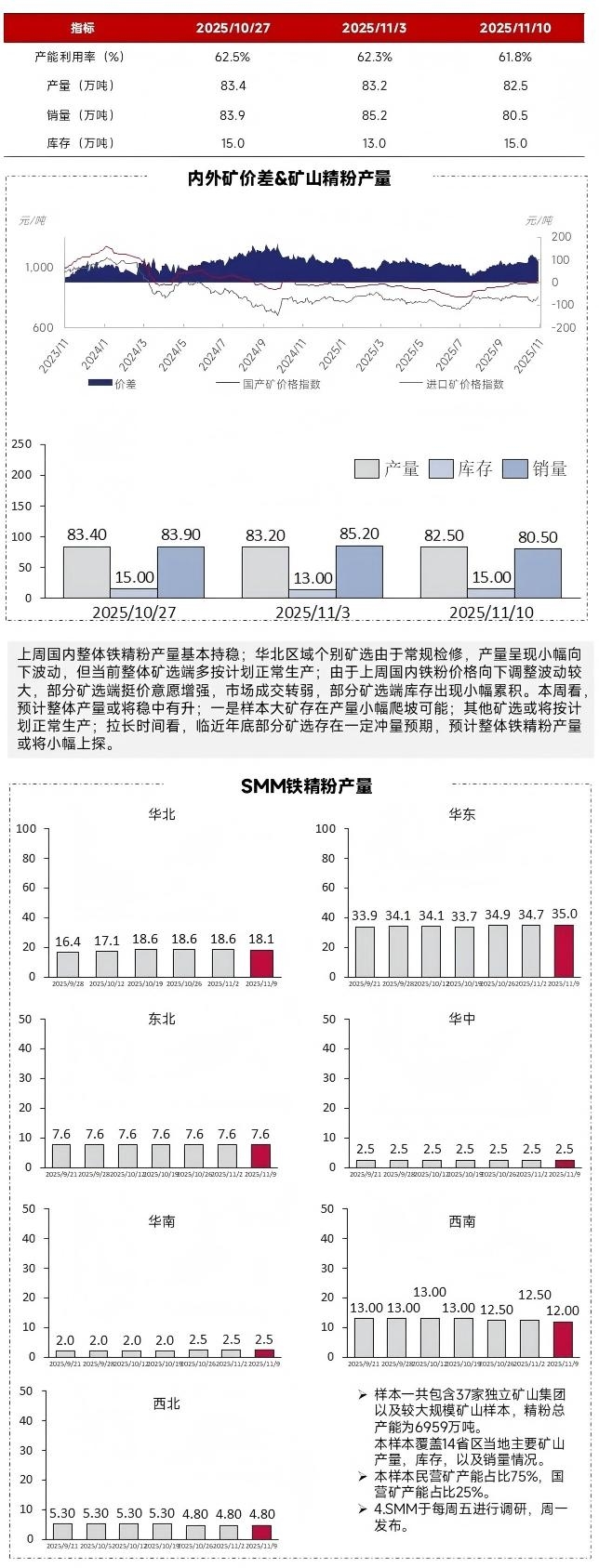 | 报告品种:铁矿石 原文链接:https://mp.weixin.qq.com/s/9j6miznx7oNW_j6QgmVWVQ?scene=1&click_id=9 根据SMM最新统计,上周国内矿山产能利用率录得61.8%,环比下降0.5个百分点;铁精粉产量为82.5万吨,较前一周减少0.7万吨。同期,矿山精粉库存上升2万吨至15万吨。 上周国内整体铁精粉产量基本持稳;华北区域个别矿选由于常规检修,产量呈现小幅向下波动,但当前整体矿选端多按计划正常生产;由于上周国内铁粉价格向下调整波动较大,部分矿选端挺价意愿增强,市场成交转弱,部分矿选端库存出现小幅累积。本周看,预计整体产量或将稳中有升;一是样本大矿存在产量小幅爬坡可能;其他矿选或将按计划正常生产;拉长时间看,临近年底部分矿选存在一定冲量预期,预计整体铁精粉产量或将小幅上探。