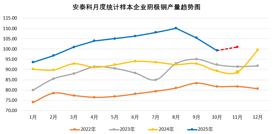 | 报告品种:铜 原文链接:https://mp.weixin.qq.com/s/ZA15aJ5_L3UFOhO_LSZbTg 说明:2025年安泰科继续跟踪调研以集团公司为统计口径的24家阴极铜生产企业,合计有效阴极铜产能1206.5万吨,较上年提高7.25%,占全国有效总产能的83.84%,2024年全年总产量占全国的93.5%。其中,100万吨及以上企业5家,总产能753万吨/年;30-100万吨企业7家,总产能265万吨/年;10-30万吨12家,总产能188.5万吨/年。(注:2025年样本企业规模分类进行了调整) 安泰科跟踪调研数据显示,2025年1-10月,24家样本企业(以集团公司为统计口径)累计生产阴极铜1029.10万吨,同比增长12.02%,其中10月份产量为99.30万吨,同比增长11.23%,环比减少5.82%。年产能规模在100万吨以上的样本企业1-10月累计完成阴极铜产量667.59万吨,同比增长13.89%,10月合计完成产量63.54万吨,同比增长9.87%,环比减少9.33%;产能规模在30≤X<100万吨的样本企业1-10月累计完成阴极铜产量215.43万吨,同比增长5.40%,10月合计产量21.67万吨,同比增长12.11%,环比增长0.39%;产能规模10≤Y<30万吨的样本企业1-10月累计完成阴极铜产量146.08万吨,同比增长14.05%,10月合计产量14.10万吨,同比增长16.33%,环比增长2.30%。 10月份,多数冶炼厂产量环比下滑,整体阴极铜产量较上月下降超6万吨,主要因为本月处于检修期的企业数量较多,加之此前的原料库存基本消耗完毕,不少企业因原料短缺被迫减产。本月生产规模较大的冶炼企业整体产量有明显下滑,而中小规模的冶炼企业产量环比少增。 11月份,行业内多数冶炼厂生产仍受制于原料紧张,但部分企业检修已经结束,叠加新投产产能的爬产,产量有望较10月稍有回升,综合预计阴极铜产量将环比小幅增加1.71%至101万吨,同比增12.74%。