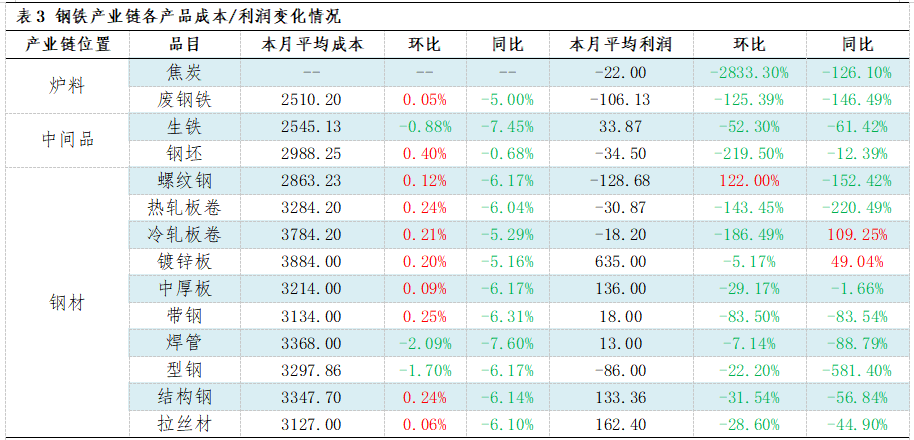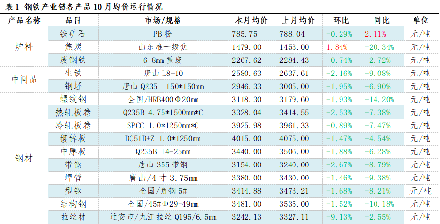 | 报告品种:螺纹钢 原文链接:https://mp.weixin.qq.com/s/qqbS5gFsqde1GCOrxyMfBA?scene=1&click_id=18 【导语】10月份外部宏观预期扰动增加,盘面表现先弱后强。受情绪及季节性影响,钢铁行业各产品价格偏弱调整,且各品种利润普遍下滑。短期展望,淡季氛围下,钢铁市场行情或难有单边突破表现。 2025年10月份,国内主要钢材品种价格普遍下跌,环比跌幅普遍在1%-3%,个别品种深跌。炉料方面,焦炭价格逆势上行,山东准一级焦价格环比上涨1.84%,但其同比价格则同比下跌20.34%,是所有监测品种中同比跌幅最深的。原因是在上半年,焦炭价格曾连续多轮提降,尽管后续曾有多轮的提涨,但当前焦炭价格并没有超过年初的高点。 分品种来看,主要成材螺纹钢的价格同环比跌幅分别为14.20%、1.93%,板材产品的价格相对富有韧性,同比跌幅普遍在4%-8%。这也反映了当前钢材品种需求出现了结构性的调整。由于年内房地产增量数据表现依旧不理想,且基建领域的项目进度未及预期,因此年内螺纹钢的价格仍存在较大的下行压力,使得其价格波动幅度更加显著;反观板材产品,由于“两新”政策的扩围实施,汽车、家电、船舶等领域用钢需求韧性较强,高附加值钢材产品的议价空间更充分。 原燃料方面,废钢和矿石价格韧性偏强,仅环比窄幅下调。由于铁水价格不断攀升,废钢铁的使用性价比已经有较大提升,长流程钢企保持了一定的废钢消耗量,对于废钢铁的底部价格起到较大的支撑作用;焦炭方面,由于近期对于查超产以及安监方面的因素,整体市场情绪偏多,后续仍需关注铁水的产量及钢厂的冬储备货计划。