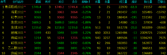 | 2025年11月12日,国内期货主力合约涨跌不一。沪银涨超2%,沪锡、丁二烯橡胶、SC原油、菜油、低硫燃料油(LU)、铁矿石涨超1%;跌幅方面,集运欧线、鸡蛋跌超3%,红枣跌超2%,焦煤、焦炭、玻璃跌超1%。