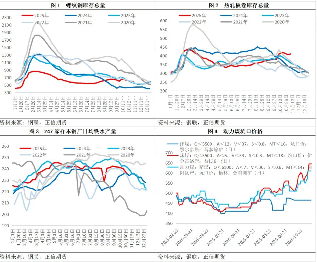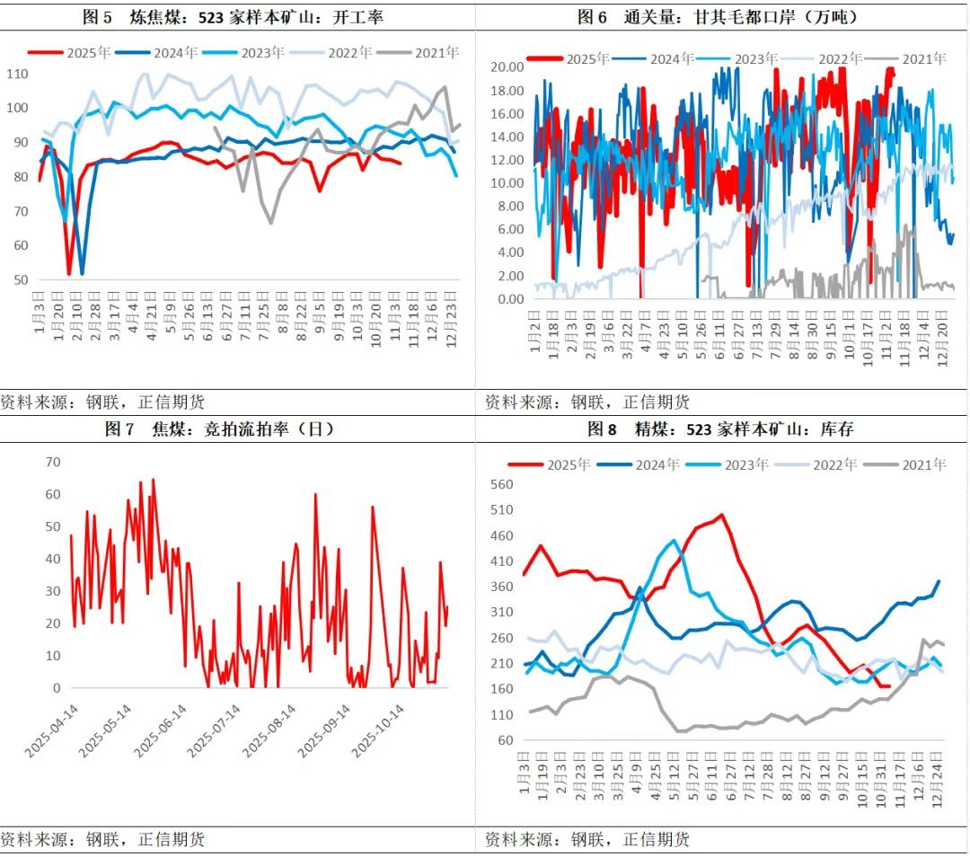 动力煤方面,在经历了十一以来的一波快速上涨后,动力煤价格近期涨势逐步趋缓,部分煤矿甚至开始调降价格,对焦煤价格形成一定拖累。其中,节后动力煤价格上涨主因供应收紧、大秦线秋检发运量减少、以及下游需求阶段性改善。目前,秦皇岛港5500卡动力煤价格已经上涨至820左右,超过发改委制定的中长期合理价格区间上限770,终端对当下价格接受度一般,询货及实际成交有限。坑口热涨局面也逐步降温,部分矿销售不畅价格转降,贸易商减缓采购节奏,终端多以长协拉运为主,矿区煤车减少。 二、基本面:供应约束持续存在,需求尚有冬储预期,做多逻辑不变 供应方面,供暖季召开能源保供会议本就为常态化操作,近几年每年都召开,保供也要求“做好安全生产工作”。在保供的要求下,会加强煤炭生产组织和运输保障,但在安全的制约下煤炭产量释放空间有限。四季度本就是煤矿事故高发期,11月,2025年度中央安全生产考核巡查已正式启动,12月部分完成年度产销任务的煤矿会提前停产,焦煤供应难有明显增量。进口蒙煤通车短期恢复高位,甘其毛都口岸日均通车数达到1400-1500车左右,但按往年规律,后期随着气温下降,蒙煤通关水平也将出现显著下滑,如图6所示。 需求方面,短期虽然面临终端需求淡季下滑的拖累,但原料冬储期逐步临近,后期会对原料需求形成较强支撑。据中国煤炭资源网消息,近期煤价快速上涨压缩焦企利润,焦企出现一定减产现象,下游对于高价煤资源采购节奏放缓,多以按需采购为主,市场情绪稍有降温,线上竞拍部分资源出现流拍及降价情况。不过煤矿预售订单仍较多,部分已排至月底,煤矿库存低位运行。可以说,焦煤需求相对前期虽有弱化,但问题不大。同时,原料冬储时间节点逐步临近(一般每年11月中下旬、12月初至春节前一两周),后期冬储仍会对需求形成较强支撑。 动力煤方面,北方大面积供暖即将开启,动力煤需求旺季到来,价格有走强预期,对炼焦煤配煤价格也会形成支撑。