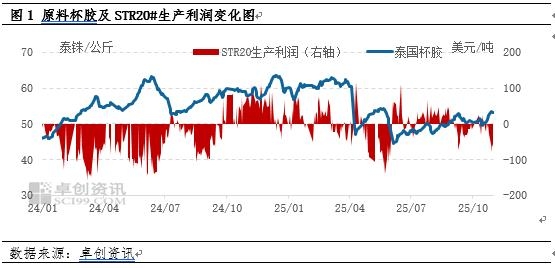 | 【导语】2025年主产区开割相对正常,但受异常气候影响,天然橡胶供应阶段性不稳定,上游原料价格处于高位,胶农的割胶积极性相对较高。然而,原料价格的持续走高对橡胶加工环节形成了一定压力,前十月产业链利润分配呈现上游修复、中游承压、下游分化的格局。 原料收购价格处于高位 工厂生产利润空间有限 从上游生产利润来看,2025年橡胶加工厂生产利润空间相对2024年有所修复,但生产利润仍旧微薄。据卓创资讯数据显示,截至10月底,泰国橡胶加工厂STR20#加工利润均值为-1.48美元/吨,较2024年均值-35.39美元/吨上涨33.91美元/吨,涨幅95.82%。具体来看,一季度,天然橡胶主产区进入由旺产季向减产期的过渡阶段,杯胶收购价格维持在60泰铢/公斤上下波动。与此同时,天然橡胶市场价格处于年内相对高位区间,工厂存在一定加工利润空间。然而,二季度在宏观经济偏空的影响下,胶价出现快速回落。但产区处于季节性上量初期,供应量相对有限,原料收购价格处于高位,工厂出现明显的亏损状态。三季度,胶价低位反弹震荡,上游工厂的加工利润空间维持在正负100美元/吨的区间内波动。此外,2025年国际市场需求不及去年同期,国际市场高溢价对上游加工厂利润的弥补有限。整体而言,2025年1-10月上游加工厂生产利润同比增加,但空间有限,对工厂的出货积极性和出货节奏均产生了明显的制约作用。
