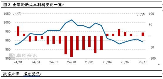 多数原材料价格下行 轮胎企业成本压力有所缓和 从下游轮胎企业成本利润分析来看,以全钢轮胎为例,根据卓创资讯监测数据显示,2025年主要原材料天然橡胶、丁苯顺丁橡胶及炭黑价格均呈现震荡下行趋势,轮胎企业的成本压力有所缓解,生产利润逐渐修复。自2025年4月份起,轮胎企业实现扭亏为盈。然而,原材料价格的持续回落导致轮胎企业被动降价,压缩了利润兑现空间。截至2025年10月底,全钢轮胎税前毛利平均为15.85元/条,较2024年均值-34.26元/条增长50.11元/条,增幅为146.26%。在此背景下,轮胎企业成本压力的减轻促使工厂原料采购积极性提升。但由于利润兑现空间有限,企业对采购节点的把控更加谨慎,年内采取逢低吸纳的采购策略,逢低采购量明显增加。