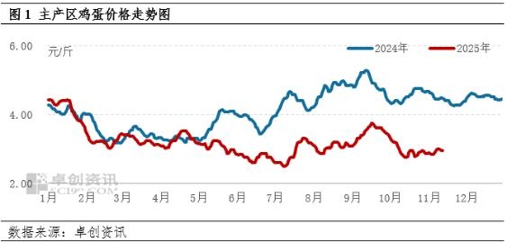 | 【导语】受供应压力持续增加、需求跟进有限压制,11月上旬主产区鸡蛋价格同环比下滑。11月中下旬需求缓慢修复,蛋价或缓慢上移,但供应压力持续释放或压制蛋价的涨幅。 11月上旬主产区鸡蛋价格同环比下滑 11月上旬主产区鸡蛋价格稳中小幅调整,最低价为3日的2.84元/斤,最高价为8日的3.01元/斤,高低价差0.17元/斤。截止到12日,主产区鸡蛋均价2.92元/斤,环比跌幅5.19%,同比跌幅35.54%,蛋价同环比下滑主要受供应压力持续增加、需求跟进有限压制。