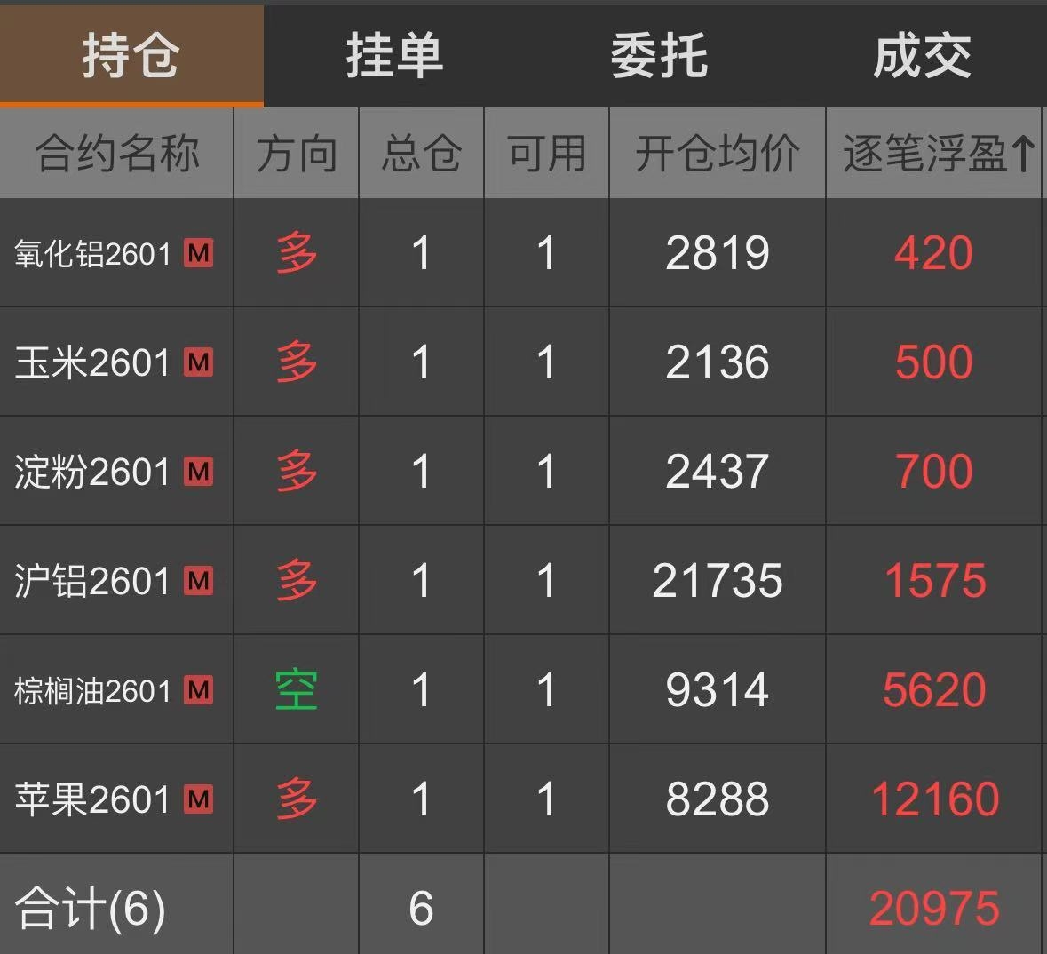 | 一、开仓总结 苹果:2025年9月22日,达到启动点的开仓条件,所以在14:54开多一手苹果2601合约,开仓价为8288。 沪铝:2025年10月13日,达到启动点的开仓条件,所以在14:32开多一手沪铝2511合约,开仓价为20885。沪铝2511合约于2025年10月17日14:45移仓至主力合约2512,开仓价为20885。沪铝2512合约于2025年11月10日13:30移仓至主力合约2601,开仓价为21735。 棕榈油:2025年10月17日,达到启动点的开仓条件,所以在14:45开空一手棕榈油2601合约,开仓价为9304。 淀粉:2025年10月31日,达到启动点的开仓条件,所以在14:49开多一手淀粉2601合约,开仓价为2437。 玉米:2025年11月4日,达到启动点的开仓条件,所以在14:51开多一手玉米2601合约,开仓价为2136。 氧化铝:2025年11月12日,达到启动点的开仓条件,所以在14:53开多一手氧化铝2601合约,开仓价为2819。 二、平仓计划 苹果:达到启动点的平仓止损/止盈条件,在收盘前或下一个交易日开盘后全部平仓。 沪铝:达到启动点的平仓止损/止盈条件,在收盘前或下一个交易日开盘后全部平仓。 棕榈油:达到启动点的平仓止损/止盈条件,在收盘前或下一个交易日开盘后全部平仓。 淀粉:达到启动点的平仓止损/止盈条件,在收盘前或下一个交易日开盘后全部平仓。 玉米:达到启动点的平仓止损/止盈条件,在收盘前或下一个交易日开盘后全部平仓。 氧化铝:达到启动点的平仓止损/止盈条件,在收盘前或下一个交易日开盘后全部平仓。 注:本交易总结由第三方提供,只作为投资理念和方法的交流,不作为七禾网的观点,也不作为投资参考和建议。 附: 1、交易者简介 十年股票/期货/外盘交易经验,每年都实现投资盈利。 擅长微观盘面分析和宏观市场分析,总结了数套有效的盈利模式,和众多高手有深入交流,收益良好。 2、持仓截图