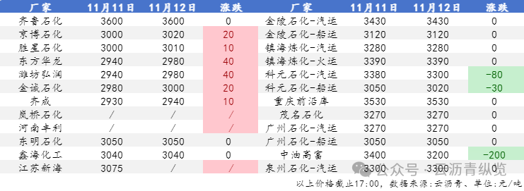 云沥青数据: 指数:11月12日云沥青价格指数3260元/吨,较上一工作日上涨4元/吨,环比上涨0.14%,较去年同期下跌326元/吨,同比下跌9.08%。 现货:山东地区主流成交价2940-3020元/吨,华东地区主流成交价3150-3180元/吨,重庆市场成交价3480-3530元/吨,华南市场成交价3130-3150元/吨。 期货:11月12日沥青期货01合约收盘价3063元/吨,较上一工作日结算价上涨26元/吨,涨幅0.86%。 基差:山东沥青01合约基差-53(-3),02合约基差-72(-8),12合约基差-53(-2);华南沥青01合约基差137(-83),02合约基差118(-88),12合约基差137(-82);河北沥青01合约基差-23(-13),02合约基差-42(-18),12合约基差-23(-12); 华东沥青01合约基差57(-13),02合约基差38(-18),12合约基差57(-12)。 供应:国内炼厂沥青总日产7.5万吨。 小结:近两日沥青市场活跃度有所提升,部分炼厂陆续释放12月份沥青合同,叠加国际油价反弹,成本支撑加强,带动沥青盘面价格回涨,沥青现货价格也有企稳迹象,今日成交价较前期小幅上行,虽然山东地区部分炼厂提货受限,但从市场总供应量来看,依然不缺货,且各炼厂保持低库存状态运行,对当前价格有所支撑。 七禾带你去调研,最新调研活动请扫码咨询