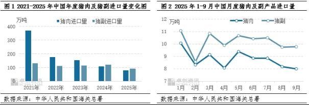 | 【导语】2025年国内猪肉产能过剩,价格处于近七年来的偏低水平。进口猪肉及猪副产品价格优势削弱,进口商拿货谨慎,1-9月进口总量皆同比下降。后期来看,进口成本略增而国产行情偏弱,预计2026年猪肉及猪副产品进口总量同比或继续下降,年内呈先减后增的趋势。 1. 2025年1-9月猪肉及猪副产品进口量皆同比下降 从图1看到,2021-2025年国内猪肉产品进口量呈持续下降的态势。猪副产品进口量于2023-2024年增加,2024年进口量首度超过猪肉;2025年猪副产品虽有下降,但幅度有限,且仍高于猪肉进口量。据中华人民共和国海关总署数据显示,2025年1-9月中国猪肉进口总量为78.79万吨,较去年同期下降1.31%。2025年1-9月猪副产品进口总量为91.44万吨,较去年同期下降0.78%,较猪肉进口量高12.65万吨。(备注:图1为2025年1-9月数据累计)