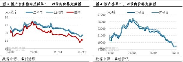 分月来看,2025年1-9月猪肉及猪副产品进口量皆震荡下降,其中猪肉进口量降幅大于猪副。据中华人民共和国海关总署数据显示,2025年9月中国猪肉进口量为8.01万吨,较年初累计下降20.32%;猪副产品进口量为9.76万吨,较年初累计下降11.57%。 2. 国产猪源充裕且进口成本抬升,制约进口商拿货积极性 导致2025年猪肉及猪副产品进口量下降主要有两方面原因。第一,国产猪肉充裕且价格偏低,对进口产品的需求减弱。从图3、图4可以看到,2025年国产鲜品及冻品猪肉价格皆呈下降趋势,进口产品价格优势削弱,下游客户采购进口产品的意向不足。进口商普遍销售不畅而降价走量,且因对后市看涨预期不足,拿货较为谨慎。其中号肉类产品因与国产价格产生“倒挂”,年内多处于有价无市的状态。