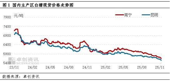 | 【导语】11月上旬,国内白糖现货价格继续呈现下滑趋势,但进入中旬,随着广西陈糖库存的不断下滑,市场出现触底反弹迹象。结合目前白糖市场供需情况,预计11月中下旬北方糖价上行空间有限,南方仅部分区域出现阶段性上涨趋势,整体利多依旧有限,糖价或环比走低。 扛价情绪转浓,糖价触底反弹 11月上旬,受甜菜糖、加工糖、广西糖以及云南糖多方面的库存压力拖累,国内供应端较为充裕,糖厂存在降价走量的意向,糖价震荡下滑,广西南宁市场均价降至5日的5660元/吨,较上月同期下滑2.41%。进入中旬,随着广西陈糖库存的不断下滑,糖厂扛价情绪转浓,糖价出现触底反弹迹象,截至11月11日,广西南宁市场均价涨至5710元/吨,较11月5日的低点上涨0.88%,但相较上月同期依旧下滑1.55%。