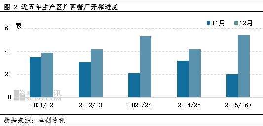 北方甜菜糖进入生产高峰期,整体供应偏充裕 9月中旬内蒙古首家糖厂开榨,同比提前4天,拉开2025/26年度国内白糖生产序幕。国庆节后北方甜菜糖厂开榨数量增加,截至10月底,新疆13家糖厂开榨,内蒙古12家糖厂全部开机,其中内蒙古累计产糖21万吨,同比增加3.1万吨,出糖率13.01%,同比提高0.84%。受甜菜种植面积增加以及糖分提升影响,2025/26年度北方甜菜糖存在增产预期,预计内蒙古和新疆总产量在155万-160万吨,同比增加8万-15万吨。 目前北方甜菜糖厂处于生产高峰期,内蒙古新糖市场价格在5520-5600元/吨,较主产区广西市场价格低150元/吨左右,内蒙古新糖虽大量上市,但报价相对坚挺,主要因为海关对泰国糖浆及预混粉管控政策升级,后期北方的冰糖厂或转用甜菜糖作为生产原料。除此之外,新疆糖价持稳在5160-5200元/吨的水平,也是受此消息的提振。南北价差的缩小导致甜菜糖难以南下,往年川渝市场销售新疆糖的情况今年暂未出现,遂带动云南、广西陈糖去库速度加快。 广西作为国内白糖主产区,2024/25榨季糖产量占到全国总量的57.92%左右。广西糖厂一般在11月陆续开榨,开榨进度主要受甘蔗成熟情况影响。但2025年广西主产区甘蔗的萌芽期和幼苗期受持续旱情影响,成熟期又受到台风天气影响,甘蔗生长进程偏缓慢,遂导致2025/26榨季广西糖厂开榨进度后移,预计11月下旬广西糖厂陆续开机生产,开榨高峰期或在12月中旬左右。