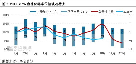 遵循季节性规律,11月价格或环比下跌 从白糖价格的季节性波动特点来看,近13年11月份价格下跌的概率较大,结合目前的供需预期,预计11月白糖现货价格或呈现前弱后强的走势。以主产区广西南宁市场为例,预计白糖现货价格运行区间在5620-5780元/吨。 结合目前白糖市场供需情况分析,从供应端来看,11月中旬主产区广西仅少数糖厂开机生产,新糖集中上市仍需12月前后,期间陈糖库存不断减少,部分贸易商有挺价动作,或带动南方糖价呈现短暂且区域性上涨走势;北方市场形成以甜菜糖+加工糖为核心,广西陈糖和云南陈糖为补充的供应架构,短期来看货源稳定性较强,或意味着价格上行空间受限。从需求端来看,11月市场需求增量空间有限,春节备货行为尚未启动,市场对跌价风险的担忧也导致中下游主动囤货意向较弱。整体来看,预计11月白糖市场利多有限,糖价或遵循季节性下跌规律。