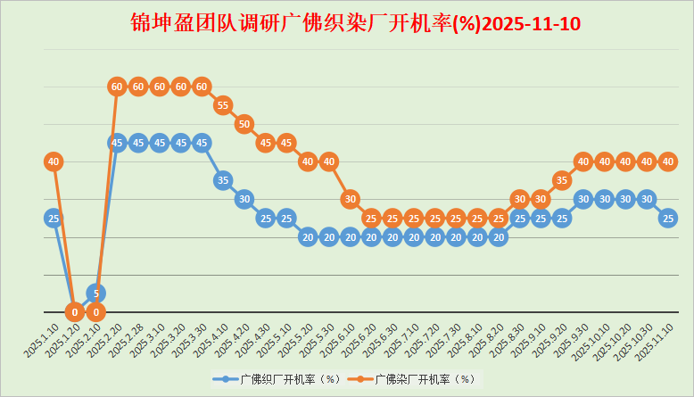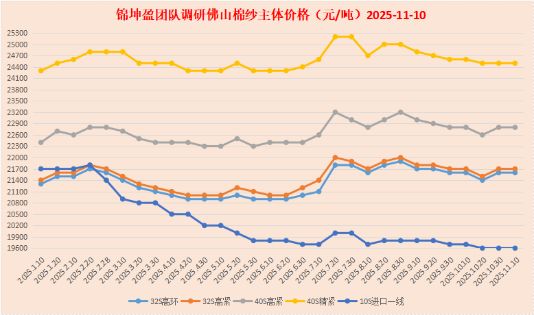 10、纺纱厂:新疆纺纱厂电力成本优势,以及各种补贴政策,稍有盈利,开机率相对稳定,并且维持产能扩张。大部分内地纺纱厂连续亏本经营,开机率下降较快。整体纺纱厂对后市信心不足,原料随买随用,刚需采购。 11、出口:中美经贸磋商重要成果落地。自2025年11月10日起,进口美棉加征关税税率将由现阶段的25%下降至10%。同时,中国纺织品服装对美出口综合加征关税税率降至约27.5%-45%(含10%芬太尼关税、10%对等关税及7.5%–25%的301关税),所有关税均降至今年3月份水平,外贸出口环境将进一步改善。 12、国内需求:国家、地方政府出台众多利好政策,拉动内需消费,纺织板块效应显现相对有限。 13、棉纱价格:棉纱现货价格基本维持前期不变,纺纱厂价格有量可议。当前佛山市场现金含税主流报价,国产牌子货纯棉32支高配环纺21500~21600元/吨,纯棉32支高配紧密21600~21700元/吨,纯棉40支高配紧密22700~22800元/吨,纯棉40支精梳紧密24400~24500元/吨,进口一线纯棉10支赛络散货19600元/吨,整柜优惠100元/吨。