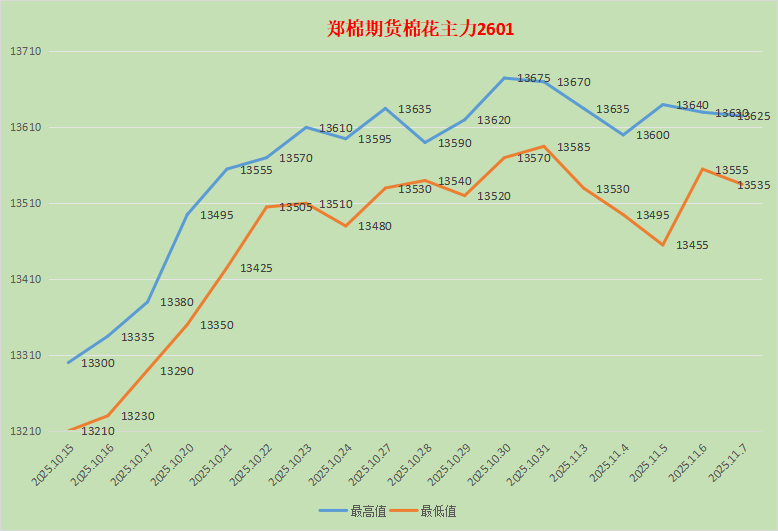 9、棉花:郑棉CF2601主力合约在13455~13640之间窄幅震荡,预计短期内仍以区间震荡为主。新棉采摘进入收尾阶段,交售价格略低于去年。