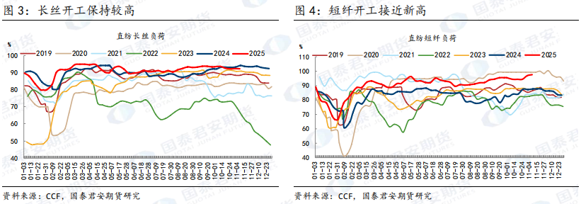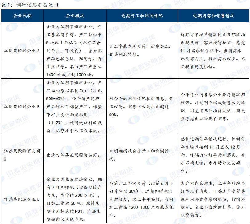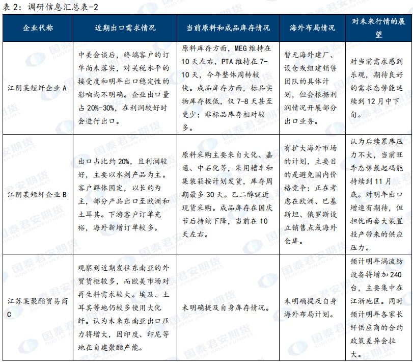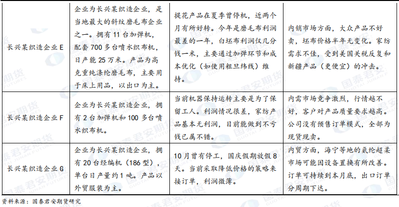 | 报告品种:短纤 原文链接:https://mp.weixin.qq.com/s/4acsEKzxY5cdayzDQgftmA 报告导读: 近期,我们走访调研了江苏、浙江的聚酯工厂和下游的加弹织造面料等企业,主要交流了解了织造服装家纺等环节订单持续性、各个环节利润和库存情况、短期和中长期的出口情况。 调研情况总结: 短纤工厂反馈近期内需表现整体较好。从订单结构来看,当前市场以刚需采购为主导,差异化产品如色纺、阳离子、再生黑丝等品种需求都较好提货偏紧。对这一轮旺季延续性较为乐观,期待需求能延续到12月或12月中下旬。工厂的开工率维持在高位水平,基本处于满负荷运行状态。在利润方面,当前加工利润总体表现较好,各企业均有通过配置差异化产品优化现金流。成品库存整体处于较低水平。标品库存普遍控制在7-10天以内,部分企业部分牌号库存降至低个位数水平。 聚酯终端内需近期表现分化,总结来看,服装好于家纺、针织好于梭织、加弹好于织布。本次的终端需求主要是内需,秋冬服装、氨纶超柔家居服等需求较好,家纺等传统品类需求相对疲软。家纺的弱势主要受到外贸环境影响和西南、新疆等区域的低价货源冲击。季节性订单在10月中旬至11月回暖但新增订单的持续性不足,多数企业订单排产到11月底或12月初。大部分企业开工率较高,利润维度,加弹环比修复,坯布环节基本处于保本线上下,面料利润总体一般。新关税谈判后,外贸发柜部分好转,但产品更多是差异化产品和例如宠物用品的及时性需求,纺织服装环节并没有发生出口激增,下游客户下单还需要反应时间,有外贸订单的接单在11月底附近,后续或要等到12月中旬的出口窗口期才有更明确的反馈。库存水平分化,多数企业当前实物库存较低,在一周以内甚至更低,相较上半年贸易战期间的30多天甚至60天显著缓解,但也有部分坯布实物达20-30天。 展望来看,内需短期支撑较强,出口近端影响不大但远端预期好转,年内仍有需求正反馈契机。纤维环节高开工、低库存、利润中性,开工率保持较高。中期新装置仍不少,2026年供需承压。 正文: 2025年聚酯需求受到众多因素扰动,一方面中美贸易博弈影响终端出口,另一方面全国多地的超长夏季拖累传统“金九银十”旺季需求。国庆节后,随着全国大部分区域显著降温,秋冬季订单带动新一轮需求预期。此外,中美贸易谈判进入新阶段,关税预期降低,芬太尼税率下调。我们走访调研了江苏、浙江的聚酯工厂和下游的加弹织造面料等企业,主要交流了解了织造服装家纺等环节订单持续性、各个环节利润和库存情况、短期和中长期的出口情况和对未来市场的展望等。 一、江阴地区短纤工厂调研情况汇总 1、近期内需和销售订单情况 短纤工厂反馈近期内需表现整体较好。某标品为主的企业表示近期客户提货速度较快,11月需求态势明显优于往年水平。从订单结构来看,当前市场以刚需采购为主导,投机性需求相对较少。一方面由于秋冬季订单的起色,另一方面是下游涡流纺的扩张给纱线环节带来的增量。虽然环锭纺在萎缩,但涡流纺的增速会比较快,设备在江苏吴江、新疆等区域还有投产不少新增,预计明年江浙地区涡流纺机器还有250-300台的增量(以192头设备、24小时生产、制成率99%、一年330天计算,如产纯涤纱大约对应9-10万吨/年的原料需求)。涡流纺的主要优势在用人少、成本低,虽然产品比较偏硬,但是现在市场环锭纺纱线也逐步接受。在产品结构方面,各家工厂均表示差异化产品如色纺、阳离子、再生黑丝等品种需求都较好提货偏紧。对这一轮旺季延续性较为乐观,期待需求能延续到12月或12月中下旬。 2、近期出口需求情况以及公司海外布局情况 本次调研短纤企业样本近期的出口需求保持稳定态势,企业出口占比普遍在20%-30%之间,主要出口市场包括欧洲、土耳其、东南亚等地区,差异化产品定位高端的会更多往欧洲土耳其去,东南亚出口市场内卷竞争较严重,中国企业出口竞争和当地的产能增长都有关系。中美关税谈判短期订单影响有限。在海外布局方面,短纤企业普遍持谨慎态度,由于出口利润明显好于内销,企业重视出口业务,当下阶段出海主要以市场拓展为主,考虑设立海外仓库或销售团队,但大规模建厂计划相对较少。企业对于明年的出口信心较强,纱厂的老板也在考虑走出去,重点区域包括中亚、巴基斯坦等。 3、近期工厂的开工和利润 短纤工厂的开工率维持在高位水平,基本处于满负荷运行状态。在利润方面,当前加工利润总体表现较好,各企业均有通过配置差异化产品优化现金流,差异化产品今年的利润水平比标品好,样本企业未来受到的现金流压力不大。当前较多企业认为均价长约模式的价格偏低,可能会在年度长约谈判上更加积极,或缩减合约规模。 4、当前原料库存情况 短纤工厂当前原料库存较稳定,具体差异主要来自于采购模式,江阴短纤工厂距离港口近,部分PTA库存维持在7-10天,MEG库存在10天左右。原料采购以合约为主,合约比例约在50%-60%。企业对煤制MEG的态度差异较大,出口客户较多和较稳定的企业主要考虑因品质的稳定性,同时认为华东煤制折扣较少,综合评估不使用煤制;但内销为主的企业大多已经较多使用煤制MEG。总体心态上来看,大多企业也基于原料供应充足,和防范下跌为主的心态,刚需采购为主。 5、当前成品库存情况 成品库存整体处于较低水平。