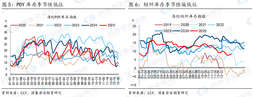 纤维环节高开工、低库存、利润中性,开工率保持较高。长丝、短纤工厂近期保持库存去化,长丝虽然部分品种提货较慢实物库存偏高但总体仍可控,短纤保持低库存。纤维环节的加工费对于大部分工厂来说偏中性,距离现金流成本还有不少距离。综合来看纤维的开工仍能保持。