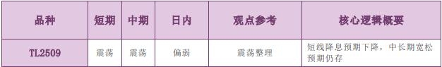备注: 1.有夜盘的品种以夜盘收盘价为起始价格,无夜盘的品种以昨日收盘价为起始价格,当日日盘收盘价为终点价格,计算涨跌幅度。 2.跌幅大于 1%为弱势,跌幅 0~1%为偏弱,涨幅 0~1%为偏强,涨幅大于 1%为强势。 3.震荡偏强/偏弱只针对日内观点,短期和中期不做区分。 主要品种价格行情驱动逻辑—金融期货股指板块 品种:TL、T、TF、TS 日内观点:偏弱 中期观点:震荡 参考观点:震荡整理 核心逻辑:上周国债期货震荡整理。目前国债期货处于上下空间均有所受限的状态。中长期来看我国内需有效需求不足的问题仍存,最新统计局公布的消费与投资数据均表现偏弱,稳定宏观内需需要偏宽松的货币环境,国债期货中长期的支撑力量较强。不过短期来看今年经济数据表现具备韧性,年末继续加码宽松的必要性不高,特别是近期海外美联储降息预期有所反复,短期内降息的可能性不高,国债期货上行动能有限。总的来说,短期内国债期货以震荡整理为主。 责任编辑:七禾小编 |