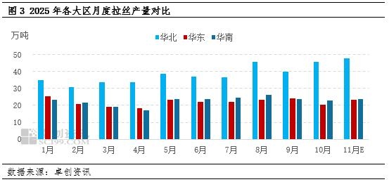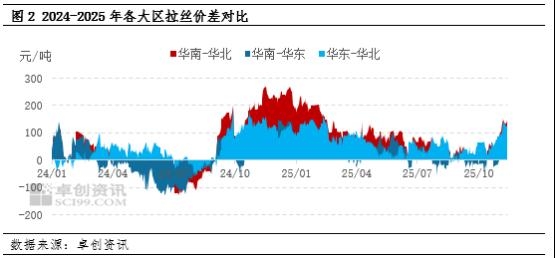 今年以来,华南-华北拉丝价差最高达到270元/吨,华南-华东拉丝价差最高在145元/吨,华东-华北拉丝价差最高在180元/吨,华南-华北拉丝价差最低达到-130元/吨,华南-华东拉丝价差最低在-130元/吨,华东-华北拉丝价差最低在-60元/吨,如下图所示,三大区价差在1-10月份逐渐收窄,但近期来看,华南、华东与华北的价差均有扩大。