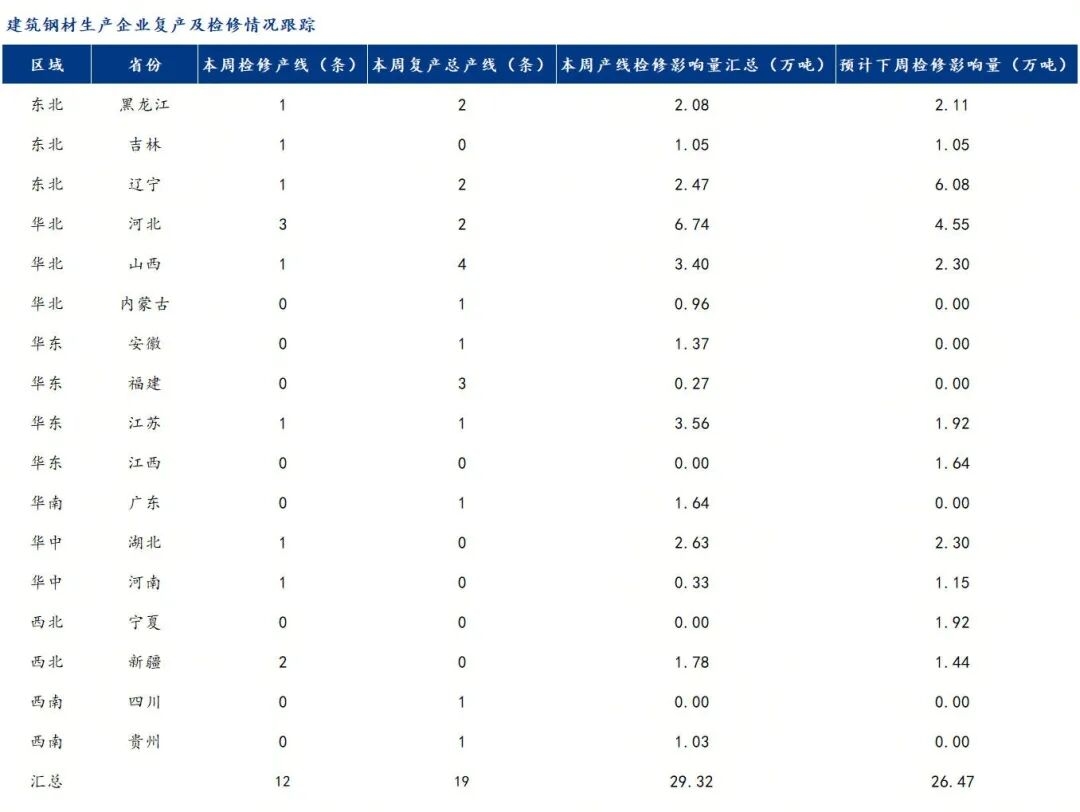| 报告品种:螺纹钢 原文链接:https://mp.weixin.qq.com/s/aEHbizSzvv8IFizXItepiA 根据Mysteel调研,本周建筑钢材企业复产增加,影响产量有所下降。具体来看,本周有17个省份的钢厂涉及产线检修、复产,其中检修产线12条、较上周减少12条,复产产线19条、较上周增加15条,按照轧机日均产量测算,产线检修影响产量29.32万吨、较上周有明显下降,预计下周产线检修影响产量26.47万吨。