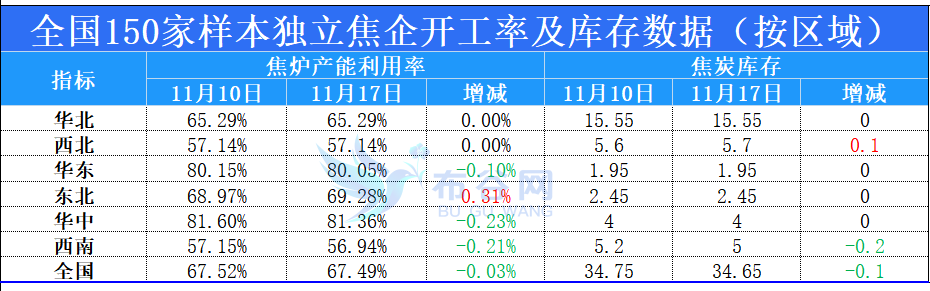 按区域划分,各产区开工率涨跌互现。其中 华北本期65.29%,环比持平; 西北本期57.14%,环比持平; 华东本期80.05%,环比下降0.10%; 东北本期69.28%,环比上升0.31%; 华中本期81.36%,环比下降0.23%; 西南本期56.94%,环比下降0.21%。 库存方面,各区域焦炭库存涨跌互现。 华北本期15.55万吨,较上期持平; 西北本期5.7万吨,较上期增加0.1万吨; 华东本期1.95万吨,较上期持平; 东北本期2.45万吨,较上期持平; 华中本期4万吨,较上期持平; 西南本期5万吨,较上期减少0.2万吨。 3、总述 供应方面,焦炭第四轮提涨全面落地,焦企生产成本压力有所缓解,但原料煤价格高位,加之环保因素,焦企供应小幅紧缩。需求方面,下游低库存钢厂采购需求仍存,焦企库存低位运行。目前焦炭市场仍呈供需偏紧状态。 七禾带你去调研,最新调研活动请扫码咨询