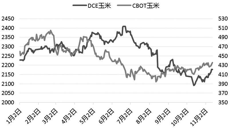 | 10月中旬CBOT玉米期货主力合约跌破410美分/蒲式耳,随后市场预期中美将会在APEC峰会期间进行贸易和谈,因涉及中国采购美国农产品,CBOT大豆领涨,美玉米和美小麦等也跟随反弹。另外,美玉米出口销售进度偏快,CBOT玉米期货主力合约重回430美分/蒲式耳以上。