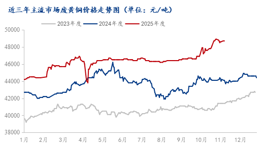数据来源:Mysteel 截至2025年11月13日,主流市场废黄杂铜的价格已涨到49100元/吨,对比去年同期约有5000元/吨的涨幅。今年以来,除开3月和4月的低谷期外,废黄杂铜价格基本处在上涨区间,尤其从9月底铜价显著攀升之后,其更是来到一个新的高度。上游货商虽在铜价上涨时获得不少利润,但与此同时,贸易的资金成本也在上升,而对下游厂家而言,还要面临着终端市场对高价产品的抵触情绪,及其所引发的利润萎缩等一些列问题。 二、市场供需情况调研 在此背景下,为深入了解废黄铜市场情况,Mysteel废铜团队针对贸易商以及下游黄铜厂等关键市场参与者进行了详细调研,结果如下: