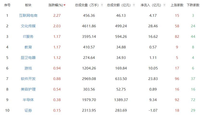 | A股三大指数集体收跌,截至收盘,上证指数报3939.81点,跌幅0.81%,成交额7909.49亿元;深证成指报13080.49点,跌幅0.92%,成交额11351.19亿元;创业板指报3069.22点,跌幅1.16%,成交额5015.67亿元。 板块方面,互联网电商、文化传媒、IT服务、教育等涨幅居前,煤炭开采加工、电池、钢铁、工业金属等跌幅居前。 A股市场板块涨跌幅排行