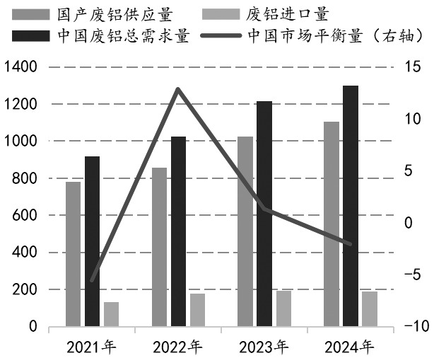图为废铝供需平衡情况 再生铝从“补充角色”到“战略必需” 铝不仅是建筑、基建等传统行业的重要材料,也在新能源汽车、光伏以及AI硬件等新兴领域扮演关键角色,其需求兼具韧性与增长空间。在此背景下,再生铝凭借显著的节能减排属性与资源循环优势,逐步从“补充角色”升级为“战略必需”。从能耗来看,生产再生铝的能耗仅为电解铝的5%左右;碳排放方面,单吨电解铝生产碳排放约11.2吨,再生铝仅为0.23吨,仅相当于电解铝的2.1%。显然,相比电解铝,再生铝在节能减排上优势突出。考虑到未来全球铝供应刚性难题暂时难以缓解,且各国对碳排放的要求日益严苛,发展再生铝行业、促进铝循环使用,不仅是增强铝供应保障能力与安全性的重要途径,也是我国实现“双碳”目标、铝产业链企业提升国际竞争力的必然选择。 近期发布的《有色金属行业稳增长工作方案(2025—2026 年)》与《中共中央关于制定国民经济和社会发展第十五个五年规划的建议》,为再生铝行业发展指明了路径,也拓展了市场对再生铝行业未来的想象空间。其中,工业和信息化部等八部门联合印发的《有色金属行业稳增长工作方案(2025—2026 年)》,首次明确“再生金属产量突破 2000 万吨”的目标,再生铝产量将达1150万吨。《中共中央关于制定国民经济和社会发展第十五个五年规划的建议》明确提出“实施碳排放总量和强度双控制度”“推动工业、城乡建设、交通运输、能源等重点领域绿色低碳转型”“促进循环经济发展”等要求。政策从宏观战略与行业细则两端协同发力,助力再生铝产业高质量发展。 再生铝行业加速洗牌 然而,行业光明前景的背后也面临严峻挑战。再生铝行业的核心瓶颈直指原料供应问题。中国有色金属工业协会的数据显示,2024年国内再生有色金属原料回收量达1565万吨,同比增长8.1%,其中再生铝国内原料供应占比达84.4%,有力支撑了产业发展,但整体废铝供应格局仍趋紧张。 具体来看,供应压力源于内外两重制约:一方面,国内社会废铝回收体系尚不完善,不仅回收量存在缺口,且原料品质参差不齐,导致利用难度较大;另一方面,进口废料渠道受海外政策不确定性影响显著。随着全球多个国家陆续出台政策限制废金属出口,以扶持本土循环产业发展,我国符合标准的进口废铝供应日趋紧张。 各国对废铝这一原料资源的争夺日趋激烈,未来,废铝的战略属性将更加凸显。以美国为例,再生铝目前已占美国铝产量的近85%,废铝对美国的重要性不言而喻。近期,美国铝业协会提出一系列旨在限制材料外流的措施,其中包括“禁止向北美以外地区出口废饮料罐及推动海外铝生产本土化”。根据ITC Trade Map的数据,2024年美国是全球最大的铝废料出口国,出口量达200万吨。一旦相关限制出口措施落地,市场可用的优质废铝原料将大幅减少,并将对包括我国在内的亚洲市场产生明显冲击。 而与供应紧张的原料废铝相比,国内再生铝产能却在持续扩张,且已呈现供应过剩局面。据相关机构统计,2024年中国再生铝产能突破1200万吨,预计2025年中国再生铝产量将再创新高,突破1400万吨。原料供应有限,而再生铝产能规模不断扩大,直接导致再生铝行业整体开工率持续偏低。 从需求端来看,我国再生铝大部分用于生产铸造铝合金、压铸铝合金产品,较少用于变形铝合金生产,终端广泛应用于汽车、建筑、电子等领域。受成分要求与材料性能制约,目前约70%的再生铸造铝合金应用于汽车、摩托车行业,呈现出对汽车市场消费的高度依赖。 值得注意的是,新能源汽车行业是此次国家“反内卷”政策的重点关注领域之一,政策核心在于规范市场秩序、减少价格战。这对再生铝行业而言是一把“双刃剑”。长期来看,健康发展的汽车产业有助于稳定再生铝需求;短期来看,整车厂的成本压力必然向上游再生铝企业传导,进一步挤压其利润空间。 除自身供需矛盾外,再生铝行业还面临政策调整带来的“阵痛”。环保、安全生产、能耗双控等要求持续提高,叠加税收返还政策调整,无疑增加了企业的合规运营成本。国家发展改革委等四部门联合印发《关于规范招商引资行为有关政策落实事项的通知》,核心在于全面清理地方政府违规税收返还行为。退税政策取消将在短期内增加企业税务成本,给再生铝企业带来更大成本压力并挤压利润空间,尤其对长期依赖补贴、靠退税生存的企业而言,将面临被市场淘汰的风险。长期来看,则将推动行业实现长久可持续发展。 据了解,在政策引导下,具体实施方案的出台与落地已逐步影响安徽、江西部分再生铝企业的生产经营,部分小型企业已出现停产或减产,大型企业也逐步下调原料采购价格。随着后续各地实施方案进一步落地,政策影响范围将逐渐扩大,进而推动行业产能优化调整。 关注21500元/吨一线压力 铸造铝合金期货以ADC12为标的,自2025年6月上市以来,在铝价整体走强及旺季需求推动下,期货价格稳步上行。该期货品种的上市,为再生铝行业逐步建立更为公平公正的价格参考基准。 原料方面,随着天气转凉,部分地区废铝回收活动减少,国内废铝供应量预计再度边际下降。同时,在海外主要废铝出口国政策干预下,进口废铝增长的空间有限。加之国内再生铝行业整体产能过剩,废铝需求长期大于供给,供应偏紧格局将持续,废铝价格将呈易涨难跌态势。 行业方面,在税收