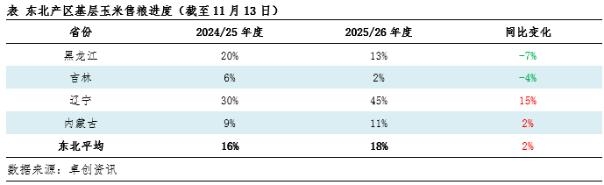 东北基层售粮进度放缓,市场惜售情绪浓厚 四季度是东北新季玉米集中上市期,基层农户的售粮进度决定了市场供应量。据卓创资讯调研了解,截至11月13日,东北产区平均基层售粮进度为18%,较去年同期偏快2个百分点。其中,辽宁进度明显快于去年同期,主要原因是新粮上市时间早,上市初期市场价格高于去年,且直收粮不宜存储,农户售粮积极性较高;吉林、黑龙江售粮进度较慢的主要原因是气温下降,低水份(水份25%及以下)易储存,以及下游贸易环节、深加工企业等收购主体积极收购。整体来看,随着市场价格走高,基层农户惜售情绪浓厚且一致,11月中旬表现较为明显。
