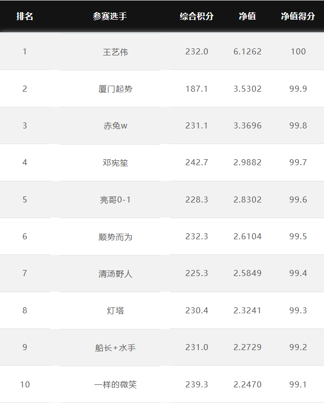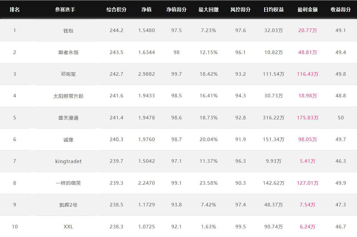奖金上不封顶 特定期货公司参赛奖金翻倍 优秀选投 每周选优秀选手对接资金 达标必投 单笔最多给1个亿管理型资金 管理型资金盈利分成20%~70% 免费培训/研报/调研/咨询 诚邀您参赛! 为了促进国内期货市场交易人才的发展和成熟,七禾网举办本次“期货CTA英雄联盟”实盘大赛&超级服务,招募优秀的操盘手,为优秀的交易人才搭建桥梁! 第四届大赛圆满结束,第五届荣耀开启,欢迎参赛!第五届大赛已于2025年7月1日开赛,火热报名中,比赛过程中持续接受报名,大赛奖金&管理型资金&超级服务,等你来领! 2023年2月16日后,在主办方指定的几家期货公司中的某一家C公司新开户参赛,享奖金翻倍! 在主办方指定的几家期货公司中的某一家B公司新开户参赛,享奖金翻倍! 大赛中的优秀选手,只要在大赛中有3个月及以上的实盘业绩,主办方将每周发送优秀参赛者的业绩、资料给合作的数十家资方,供其考察是否投管理型资金。至2022年8月12日,资方已选出23名优秀投顾,累计投入超5.5亿元管理型资金。 优秀选投:通过主办方及资方考核后,将获得管理型资金(资金来源:七禾网自有资金(买优秀选手的基金产品)、七禾网股东、数十家合作资方) 在主办方指定的几家期货公司中的某一家B公司新开户参赛,以及2023年2月16日后,在主办方指定的几家期货公司中的某一家C公司新开户参赛,可以按照:“达标必投”进行考核(将给予单笔100万元~1亿元的管理型资金,分红比例20%~70%),详细规则请联系微信:15858201632 大赛综合排名前10名 2025.11.18