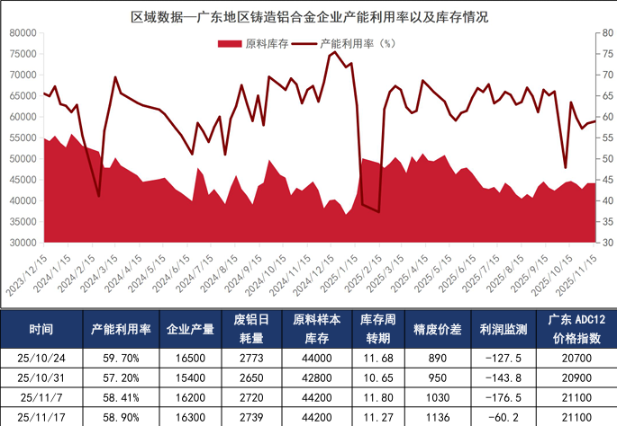 | 报告品种:铸造铝合金 原文链接:https://mp.weixin.qq.com/s/pPq13qUMjkhN3bEc57baGg 截止2025年11月17日,当周广东铸造铝合金企业产能利用率为58.90%,环比上周上涨0.5个百分点;广东样本企业铸造铝合金总产量为16300吨,环比上涨100吨;企业废铝原料库存平均周转期为11.27天,环比下降0.5天;样本企业原料库存总量为44200吨,环比上周持平;周内广东铸造铝合金企业废铝日耗量为2739吨/天,环比上涨19吨/天;据富宝监测,周内广东区域铸造铝合金锭生产理论利润空间位-60.2元/吨,较上周亏损值收窄116元/吨。 当周广东地区铸造铝合金企业开工基本持稳为主,据企业反馈,当前下游终端车企投放订单仍未有明显增加,尽管汽车产业产销同比数据略有下滑,不过市场信心仍偏强,部分企业已提前备好原料等待年末最后一波产能爬升;根据季节性规律分析,12月内多数终端企业为冲击全年销量将有大量订单放出,届时铸造铝合金市场或将面临供不应求情况,而当下广东区域内虽能保持稳定原材料购入,但基本以高价货源为主,尤其部分未税货源需要进行反开,在前端公司开票额度受限的情况下未来进项票问题或成为掣肘铝企开工率提升的一大核心要素。 原材料方面,随着广州海关针对美国转口贸易稽查(主要针对铜)的接近尾声,海关退柜率有所好转,近期市场进口废铝到货量出现显著回升,或带动原材料市场价格回归常态,部分省内企业将加大对进口料的采购,而外省如川渝、安徽等地仅有部分税收洼地地区可维持长期采购,影响不大,当下佛山雅瑶市场贸易商隐性库存仍较大,未来废铝价格有望跟跌不跟涨,货源流通趋于宽松。