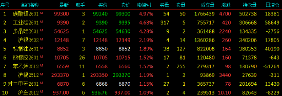 | 2025年11月19日,国内期货主力合约涨跌互现。碳酸锂、工业硅、多晶硅涨超4%,沪银涨超2%,棕榈油涨近2%。跌幅方面,纯碱跌超3%,焦煤、集运指数(欧线)跌超2%,氧化铝、花生跌近2%。