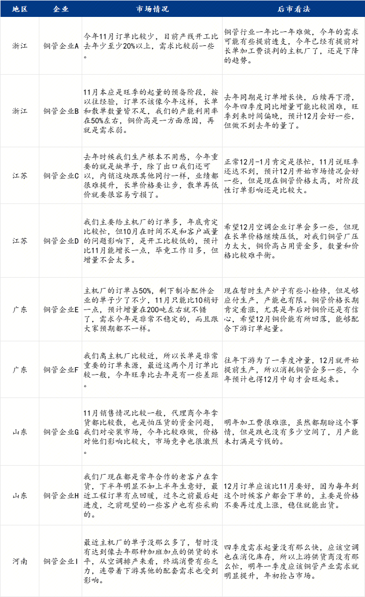 | 报告品种:铜 原文链接:https://mp.weixin.qq.com/s/Ux_9w90pn6zchopNWGqI3Q 近期铜管市场整体呈现价格震荡下行与需求持续疲软的双重特征,尽管处于传统消费旺季的尾声,但市场并未表现出往年的活跃态势,反而在多重因素影响下显得动能不足。一方面,铜管价格受电解铜成本支撑减弱影响出现明显下调,另一方面,下游核心应用领域如空调制造业的需求不及预期,导致铜管生产企业订单不足,产能利用率同比下滑10%-15%。当下铜管企业运行情况如何?年末收官企业信心是否充足?为此Mysteel调研了铜管各主产区具有代表性的各家企业,了解市场实际情况,汇总如下: