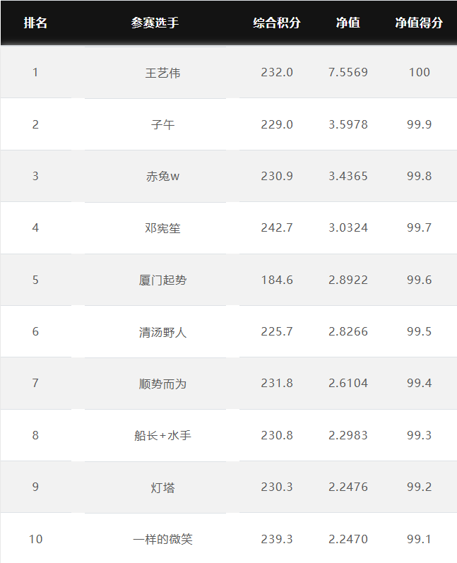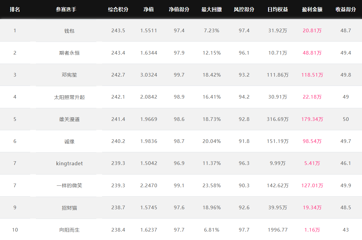 奖金上不封顶 特定期货公司参赛奖金翻倍 优秀选投 每周选优秀选手对接资金 达标必投 单笔最多给1个亿管理型资金 管理型资金盈利分成20%~70% 免费培训/研报/调研/咨询 诚邀您参赛! 为了促进国内期货市场交易人才的发展和成熟,七禾网举办本次“期货CTA英雄联盟”实盘大赛&超级服务,招募优秀的操盘手,为优秀的交易人才搭建桥梁! 第四届大赛圆满结束,第五届荣耀开启,欢迎参赛!第五届大赛已于2025年7月1日开赛,火热报名中,比赛过程中持续接受报名,大赛奖金&管理型资金&超级服务,等你来领! 2023年2月16日后,在主办方指定的几家期货公司中的某一家C公司新开户参赛,享奖金翻倍! 在主办方指定的几家期货公司中的某一家B公司新开户参赛,享奖金翻倍! 大赛中的优秀选手,只要在大赛中有3个月及以上的实盘业绩,主办方将每周发送优秀参赛者的业绩、资料给合作的数十家资方,供其考察是否投管理型资金。至2022年8月12日,资方已选出23名优秀投顾,累计投入超5.5亿元管理型资金。 优秀选投:通过主办方及资方考核后,将获得管理型资金(资金来源:七禾网自有资金(买优秀选手的基金产品)、七禾网股东、数十家合作资方) 在主办方指定的几家期货公司中的某一家B公司新开户参赛,以及2023年2月16日后,在主办方指定的几家期货公司中的某一家C公司新开户参赛,可以按照:“达标必投”进行考核(将给予单笔100万元~1亿元的管理型资金,分红比例20%~70%),详细规则请联系微信:15858201632 大赛综合排名前10名 2025.11.19
