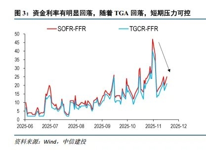 货币市场趋紧、资金利率走高带来的流动性冲击,不太可能是主要原因。在11月第一周,美股开始调整,黄金也未能幸免,市场普遍将原因归咎于流动性危机,当时短端资金利率出现明显抬升,政府关门导致财政存款激增、商业银行准备金骤降。但短端利率单日波动较难引发其他大类资产的抛售,且11月第二周开始,资金利率已经恢复平稳,政府重新开门,准备金压力大概率缓解,用流动性不足解释黄金和纳指的趋同,存在瑕疵。