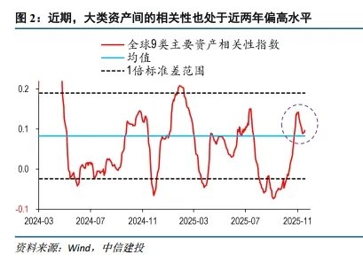 实际上,上述现象不局限在黄金和纳指的范畴内,大类资产整体的趋同性,在近期均有所加强。选取全球常见的股债汇商等资产,计算其相关性水平,显示:10月以来,整体资产正向关联水平持续上升,11月后,处于过去两年的偏高水平,且保持在历史均值之上。因此,纳指和黄金的同涨同跌,可能不是孤立现象,而是更广泛存在。