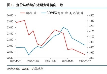 | 11月以来,纳斯达克指数和黄金价格的正相关性有所加强,经常出现同涨同跌的情况,引起市场关注。 11月以来,金价与纳指多次出现同涨同跌的状况,由于二者分属避险资产和风险资产,其相关性的上升,引发市场对于更深层次风险的担忧。例如:11月4日,纳指跌2%,黄金跌1.8%;11月10日,纳指涨2.3%,黄金涨2.8%;11月13日,纳指跌2.3%,黄金跌0.6%;11月17日,纳指跌0.8%,黄金跌1.6%。