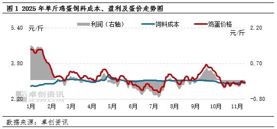 | 【导语】2025年蛋鸡养殖行业迎来了深刻的周期性调整。在持续的价格低迷与盈利压力下,市场自发启动了供需平衡机制。养殖端通过加速淘汰低效产能以应对困局,但是这种“自救”行为却加剧了短期市场的波动,即老母鸡出栏量的急剧增加及价格的不断下滑。但是这种周期性的波动,也是为未来价格修复奠定了基础。 市场困局——持续亏损下的行业现状 数据是市场最直接的语言。回顾2025年下半年,鸡蛋价格持续在3.00元/斤上下徘徊,截至11月13日,主产区鸡蛋均价3.08元/斤,而单斤鸡蛋饲料成本却达到了3.00元,养殖端盈利状况持续欠佳。并且截至11月13日,下半年单斤鸡蛋的平均利润为-0.12元,而进入11月以后,形势进一步加重,单斤鸡蛋利润降至-0.20元,较10月平均水平减少0.03元。利润的持续下滑,导致企业现金流与生存空间持续挤压,四季度迎来了淘鸡加速的基本面现状。