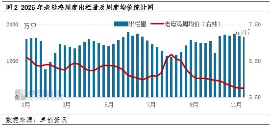 自救之举——淘汰加速与价格传导 在持续亏损的重压下,理性的养殖企业唯一的选择就是缩减产能,以止损求存。这一行为最直接的表现,便是淘鸡心态的加剧与老母鸡出栏量的持续增加。据卓创资讯数据监测显示,10-11月期间,老母鸡出栏量显著增加,环比分别提升6.74%、3.37%(11月的出栏量截至第二周)。这一增长的背后,是养殖企业尝试通过淘汰低效产能来降低饲料成本、回笼资金做出的努力。然而,当整个行业形成一致的淘汰预期并同步行动时,老母鸡供应急剧增加,而终端需求跟进有限,导致其价格出现明显下滑。据卓创资讯监测数据显示,截至11月第二周,11月老母鸡均价4.01元,较10月降幅5.87%。这就形成了产业链的“双重压力”:一方面主产品鸡蛋价格在亏损;另一方面,老母鸡作为养殖周期结束时的重要收入来源,其价格的下滑也进一步压缩了养殖企业的现金流和盈利水平。这种双重挤压极大考验着养殖企业的抗风险能力,进而加速了弱势产能的出清,也正是这种残酷的压力,成为了驱动蛋鸡市场走向再平衡的核心动力。