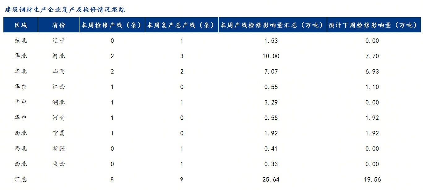| 报告品种:螺纹钢 原文链接:https://gc.mysteel.com/a/25112210/B64875EB5947E14C.html 根据Mysteel调研,本周建筑钢材企业检修及复产规模明显缩小,影响产量有所下降。具体来看,本周有9个省份的钢厂涉及产线检修、复产,其中检修产线8条、较上周减少4条,复产产线9条、较上周减少10条,按照轧机日均产量测算,产线检修影响产量25.64万吨、较上周下降3.67万吨,预计下周产线检修影响产量19.56万吨。