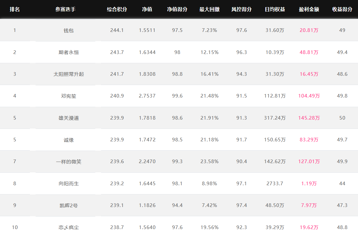 奖金上不封顶 特定期货公司参赛奖金翻倍 优秀选投 每周选优秀选手对接资金 达标必投 单笔最多给1个亿管理型资金 管理型资金盈利分成20%~70% 免费培训/研报/调研/咨询 诚邀您参赛! 为了促进国内期货市场交易人才的发展和成熟,七禾网举办本次“期货CTA英雄联盟”实盘大赛&超级服务,招募优秀的操盘手,为优秀的交易人才搭建桥梁! 第四届大赛圆满结束,第五届荣耀开启,欢迎参赛!第五届大赛已于2025年7月1日开赛,火热报名中,比赛过程中持续接受报名,大赛奖金&管理型资金&超级服务,等你来领! 2023年2月16日后,在主办方指定的几家期货公司中的某一家C公司新开户参赛,享奖金翻倍! 在主办方指定的几家期货公司中的某一家B公司新开户参赛,享奖金翻倍! 大赛中的优秀选手,只要在大赛中有3个月及以上的实盘业绩,主办方将每周发送优秀参赛者的业绩、资料给合作的数十家资方,供其考察是否投管理型资金。至2022年8月12日,资方已选出23名优秀投顾,累计投入超5.5亿元管理型资金。 优秀选投:通过主办方及资方考核后,将获得管理型资金(资金来源:七禾网自有资金(买优秀选手的基金产品)、七禾网股东、数十家合作资方) 在主办方指定的几家期货公司中的某一家B公司新开户参赛,以及2023年2月16日后,在主办方指定的几家期货公司中的某一家C公司新开户参赛,可以按照:“达标必投”进行考核(将给予单笔100万元~1亿元的管理型资金,分红比例20%~70%),详细规则请联系微信:15858201632 大赛综合排名前10名 2025.11.24
